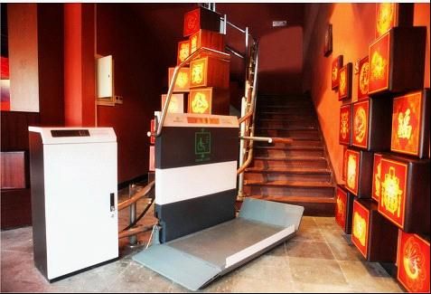 齿轮齿条式驱动机构,沿楼梯做上升和下降,只能作直线运行不能转弯,倾斜角一般不大于35度,适用于楼层较低、中间没有水平段的直线型楼梯。曲线型采用绳球链式传动,不仅能做上升和下降,还能做水平、转弯和螺旋形运行,适用范围较为广泛。该设备为乘坐轮椅的残障人员上下楼梯提供了极大的便利,现被广泛地应用在家居住宅和公共场所的楼梯上。它紧凑合理的折叠平台可以在不使用的情况下轻巧的折叠起来,为楼梯节省足够的空间,完全不影响他人的通行。是商用和家用无障碍轮椅通行的理想解决方案。