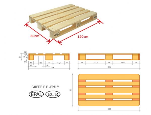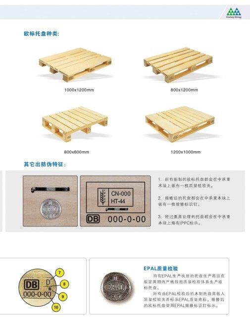 木材制成,对托盘的规格尺寸,承载能力,木材的种类、湿度,托盘钉的规格、外观都有统一规范的标准要求,符合IPPC及UIC规定。在托盘的几个部位和托盘钉头上都有特定的标识,每一批产品都必须通过瑞士通用公证行(SGS)的严格检验方能出厂。托盘在循环使用中,用户会按照统一的标准判定托盘是否需要维修或淘汰。统一的标准,严格控制的质量控制体系,保证了EPAL托盘在全世界范围内安全使用,便捷顺畅地流通。