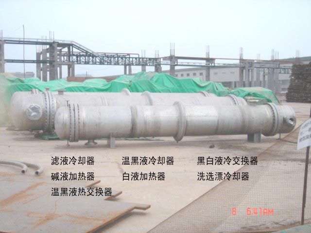 冷却器 滤液走壳程、黑液走管程,把洗选漂工段滤液槽的黑液温度由84℃冷却为76℃的黑液进入蒸煮工段回收槽里。