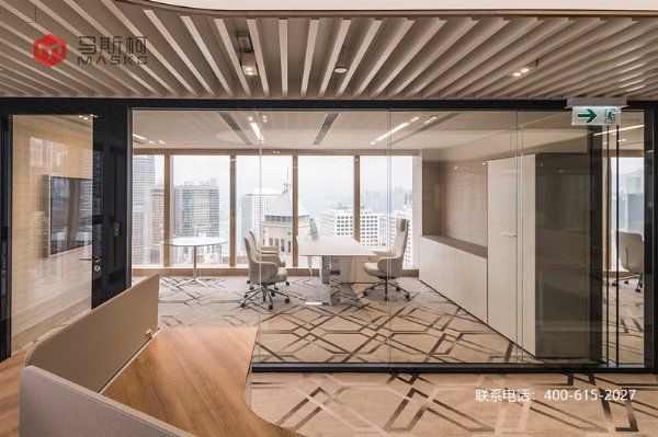 室内办公空间设计采用海莱² (Hyaline²) 全景无框玻隔断墙体。兼顾采光和隔音的双重要求;尽可能地将室外光线引入办公空间,营造出简洁、通透、明快、现代、舒适的办公环境。