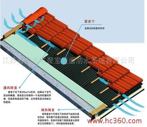 除湿: 由于在爱舍宁和屋面瓦之间有非常良好的通风条件,所以能保证屋面瓦下很好的去潮湿干燥的能力。
