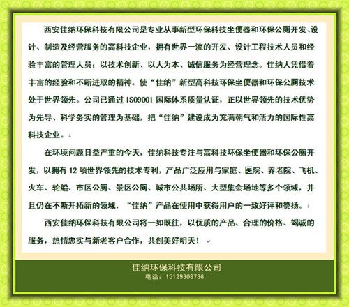 塑料袋包装储存粪便、自动更换塑料袋、并且能直接将使用时的异味吸入坐便器后排出卫生间外,因此使用时无任何异味,卫生舒适。联系人:汤先生 电话:02933326602 手机:13468510736 QQ:347721549西安佳纳环保科技有限公司。
