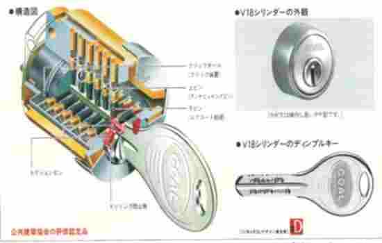 高精度的18粒销棒所实现的120亿分之1的互开率。独特的防范铁丝等不正当撬锁的设计。通过苛刻的美国UL防范认证以及日本CP认证的锁芯