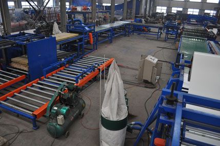 岩棉(堆垛)-(整张的岩棉的)推出-分条(矩形条和梯形条)-输送-翻转-摆放(到复合机上)-涂胶-复合。