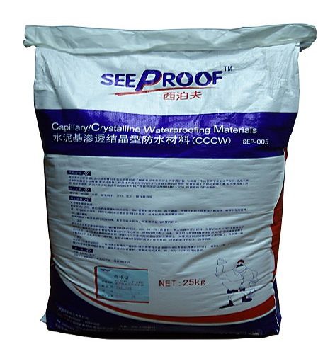 CCCW水泥机渗透结晶型防水材料中溶出的硅酸离子随着表层水在混凝土中渗透扩散,与混凝土中的钙离子发生化学反应,生成不溶于水的硅酸钙水化物(枝蔓状结晶体),结晶体充满毛细管孔隙并与混凝土结合成整体,堵塞混凝土内部的毛细孔道,从而使混凝土致密,防止水渗漏。并且,CCCW具有催化特性,一旦遇水可以不断产生化学反应,生成的结晶体不断生长并填充混凝土内部的毛细孔隙,因此,混凝土结构即使局部受损发生渗漏,在遇到水后也会产生结晶作用自行修补愈合(0.4mm的裂缝)。根据实验,CCCW产生的结晶体可以修复0.4mm的裂缝,所以,对于0.4mm的裂缝CCCW具有自我修复愈合的作用,不需要做其他的防水层修补,CCCW具有多次抗渗和自我修复的特点和性能,并且具有极强的抗压能力,*高可达3.0MPa,防水层和混凝土表面形成完整的体系,不会分离,并且材料可以充分吸收混凝土表面的水分来参与其结晶反应,不会发生空鼓现象。由于具有透气不透水的特点,因此可以和混凝土结构同步进行养护。