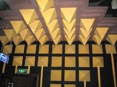 纤维板正面开立体三角墙,背面开圆孔的结构吸声材料,饰面喷漆,背贴防火吸音布。材质及颜色根据客户需要,有