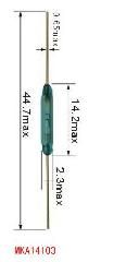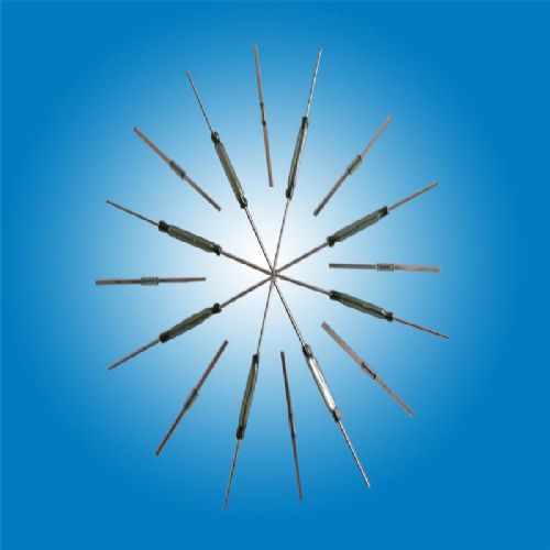 里,玻璃管内平行封装的簧片端部重叠,并留有一定间隙或相互接触以构成开关的常开或常闭触点。 干簧管