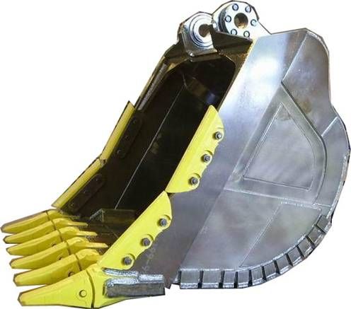 岩石斗:材料选用16MN+高强度耐磨钢NM360及HARDOX400材料,在加强型挖斗的基础上左右加固板,底部加固板齿座板用边板(侧板)加厚,采用国产优质斗齿座。主要适用于土中混有较硬石块、次坚石、风化石的挖掘、坚石、爆破后的矿石的装载等重作业。