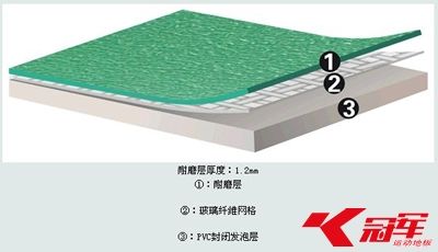 KEMP冠军羽毛球*塑胶地板产品结构中添加了1000D的玻璃纤维补强网和特殊