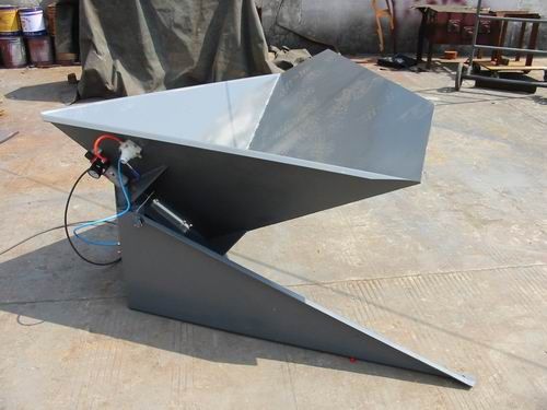 气缸使平台倾斜。当料箱约半空时,调节气压开始抬起平台,然后开始自动倾斜。在输料过程中,平台不断倾斜。大型倾料机适用于操作极重的料箱。另外,在设定倾斜气压前,应有约一半的物料被卸空。当倾料机斜度超过平衡点,凸轮关掉气缸气源,保持安全运动。