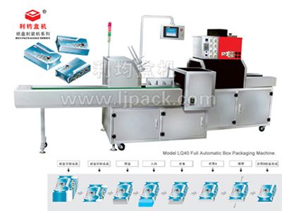 LQ40装盒机集开盒、装料、折盒、喷胶、封盒为一体, 适用于多种规格的纸盒包装