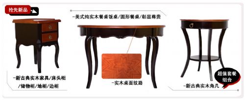 帕斯纳维实木家具组合套装,餐桌,圆角几,床头柜