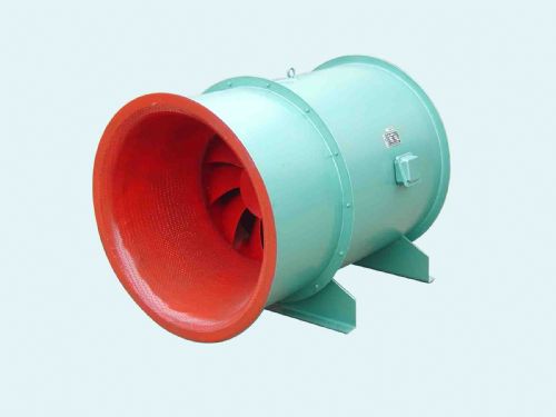 采用子午加速特点的锥面扭曲形叶片在轮毂上焊接,进口处采用流线喇叭形消声器与风筒联接成整体,内装有导叶,具有良好的气流分布,压力稳定,是一种介于轴流和