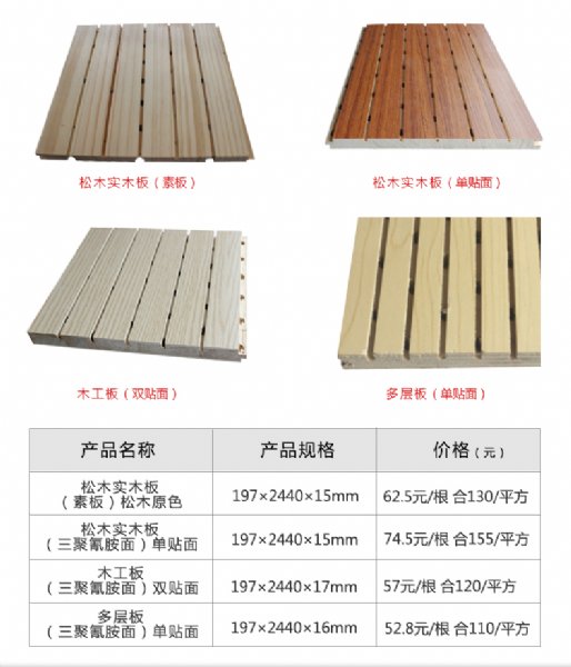 防潮板为基材,根据声学原理正面开槽,背面开孔处理;表面为环保聚酯纸帖皮,背面为高级防火吸音毡;用于控制和调整室内混响时间、消除回声、改善音质、提高语音清晰度,还可以降低室内噪声级,改善生活环境和工作条件;是一种新型的室内吸音、消音材料。