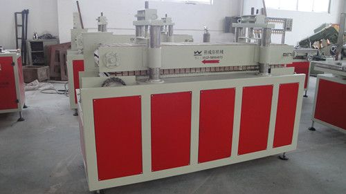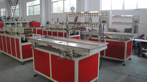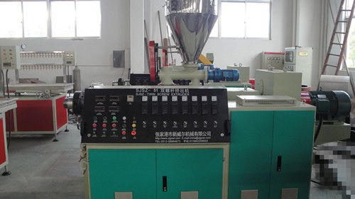 螺杆挤出机,PVC原料在这里开始塑化,挤压通过模具成型,再由真空定型台上的定型模通过抽真空和冷却水定型,通过牵引机自动牵引,调节牵引机速度,使挤出机的挤出同牵引机同步,将旋转