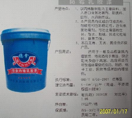 乳胶漆亦称抗菌乳胶漆,天津美居涂料厂家批发电话联系我厂张经理。天津美居涂料荣誉产品--稳拿牌防霉乳胶漆,品质优异,价格实惠,是您装饰*乳胶漆。抗菌乳胶漆