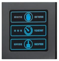 按下房间内的“请勿打扰”开关,触摸屏的“请勿打扰”图案背光被点亮,提示请不要打扰,此时门铃按键不起作用,墙外的门铃不工作。