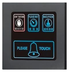 酒店门铃触摸控制系统,具有超豪华的外观设计、操作方便简单的特点,背光触摸屏按键,门铃发音主体音质通秀悦耳,是普通电子音乐门铃不可媲美的。MCU可编程电路控制,1路“请勿打扰”和1路 “请即清理”指示,可以完全取代传统机械式门铃开关,当“请勿打扰”指示灯点亮时,按门铃键时门铃不响,同时“请勿打扰”指示灯闪烁,智能化互锁指示;当客房主人暂时不方便会客时,按下室内的“请稍后”开关,室外的显示面板相应的指示灯闪烁,并且门铃键失效,2分钟后,“请稍后”自动恢复暗背光。