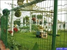 钢管支柱固定。经过几年的风霜雨雪,太阳的暴晒,还是光亮如新,抗紫外线能力极强。绿色的草坪在白色金属网的衬托下,显得清新整洁。