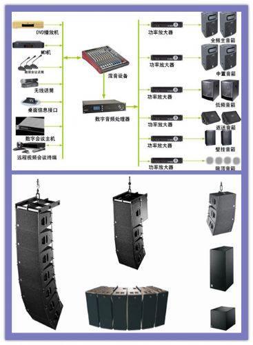 要取得一个厅堂内所需要的声学效果必须具备声音还原设备(如音箱)、声音放大设备(功放)、声音处理设备(均衡器、反馈抑制器、压限器等)、混音设备(调音台)。