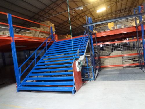 升降平台上下楼上货物。多层搁楼式货架能够简单高效的利用仓库空间。
