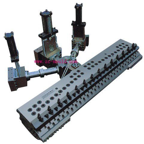 上模唇带有调节装置,下模唇可更换的三层模内复合衣架式机头,设有调节灵活阻流棒,配有单层、双层、三层流道组合,可将三种原料或三种颜色物料模内复合,可生产片板材等产品。适用原料:PVC、