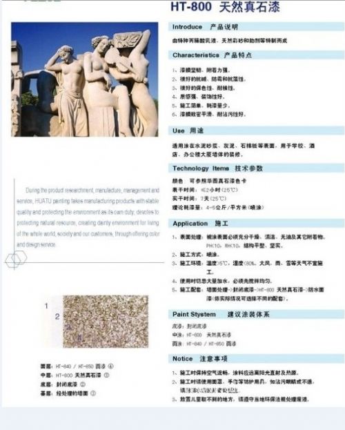 后的建筑物,具有天然真实的自然色泽,给人以高雅,和谐,庄重之美感,适合于各类建筑物的室内外装修。特别是在曲面建筑物上装饰,可以收到生动逼真,回归自然的功效,专业人专业心专业漆。