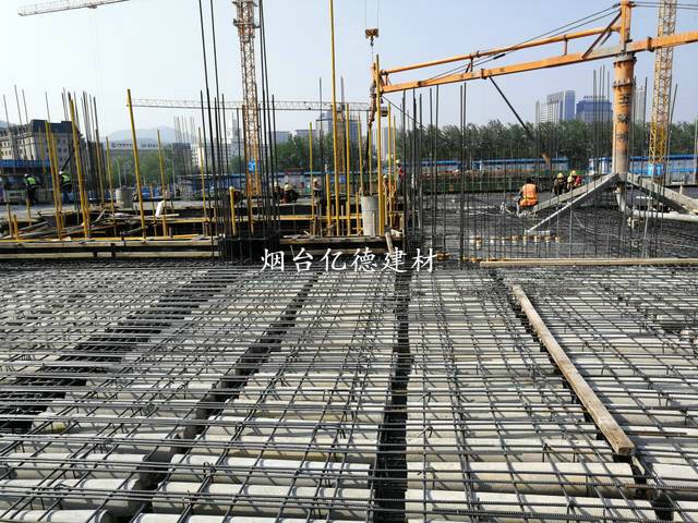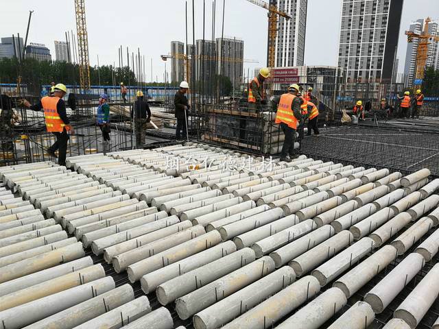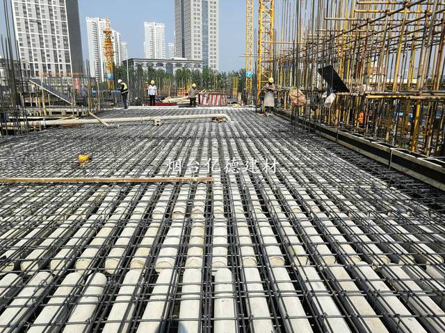 钢筋网片,兼做空心管抗浮筋2m长空心管上方布置两道马凳筋,1m长空心管上方布置一道马凳筋,加设30厚垫块,防止空心管上浮,有效控制空心管在空心楼板中的上下位置。