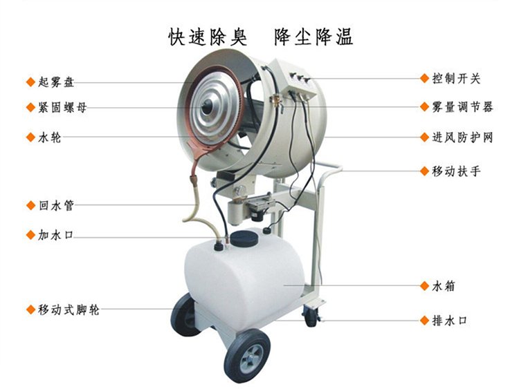 产品应用广泛,适用性强。特别适应于需要降温除尘、去除异味的作业施工现场、垃圾处理中心、喷涂行业,需要加湿除静电的纺织、电子、印刷、烟草、食用菌、种植、养殖、人工景观、超市保鲜、实验室、汽车等行业。