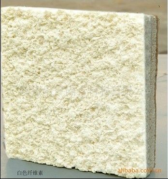 木材、树皮、废纸等)经过化学处理而形成的一种全新高效吸音隔声、保温隔热喷覆式装饰材料,该产品不含石棉、玻璃纤维以及其它人造矿物纤维,是绿色环保型产品。天然植物纤维经特殊化学处理后具有防火性,抗压性及防霉、防虫蛀的特性,与专利黏合剂结合起来,形成了具有高附着性、耐久性及强度的整块涂膜。植物纤维素(E-100)可喷覆在任何固体的建筑基层上,如木材、金属、混凝土、玻璃、