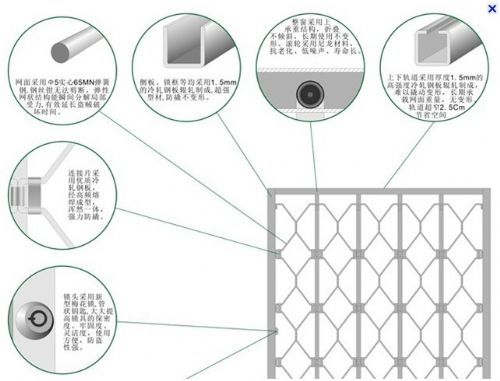 2. 防护窗的上下轨道及锁板、侧板、支杆、钢环连扣均选用优质冷轧