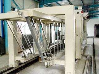 把模具松开、脱模并把坯体连同侧板(模具底板)放置在切割小车上,切割小车继续行走至横切工位处,横切架自上而下运动,切割钢丝作锯状摆动,完场垂直切割,此时坯体已按要求完成六面切割;然后切割小车再行走至完成品吊具工位,由半成品吊具将坯体连同侧板一起吊至蒸养小车上编组等蒸养,此时切割小车返回至初始位置进行下一个切割循环。