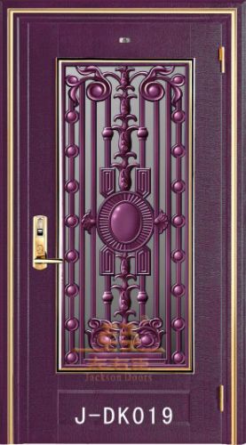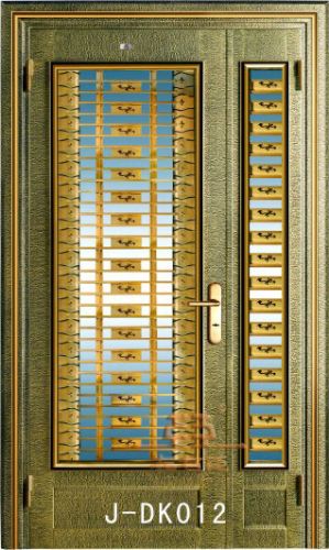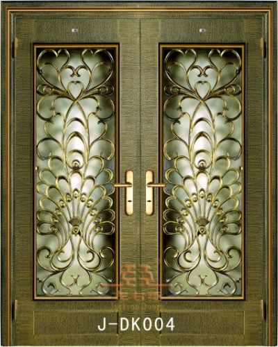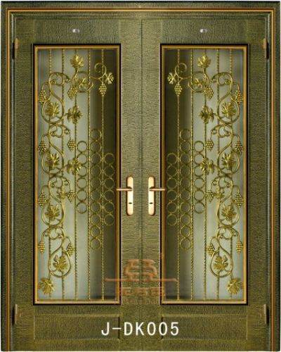 B 经济型: 1、材料:门框1.0mm不锈钢浮雕艺术板,门扇0.8mm不锈钢浮雕艺术板; 2、门花:实心铸铝花、空心不锈钢花 3、玻璃:5.0mm厚钢化玻璃; 4、装饰条:正、背面金黑相间铝饰条(铝花系列)、不锈钢浮雕艺术板饰条(铝板系列); 5、锁具:万嘉锁 6、铰链:5′′不锈钢1#异形铰链; 7、门框、门扇表面经过浮雕处理后手绘环保仿古金漆。
