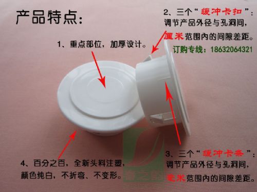 5、活动式盖帽,随拆随扣。平时盖上盖子对墙孔起到封闭作用,安装空调(管道、烟道)时可拆掉盖子又可对洞口起到装饰作用。