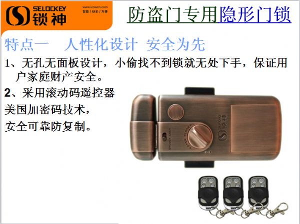 4.遥控器开锁,4键遥控按键分别控制锁“X”和“Y”两个系统,滚动码遥控器每次自动生成不同密码,遥控器内部密钥采用美国先进技术由本公司自主编程,防复制更安全。