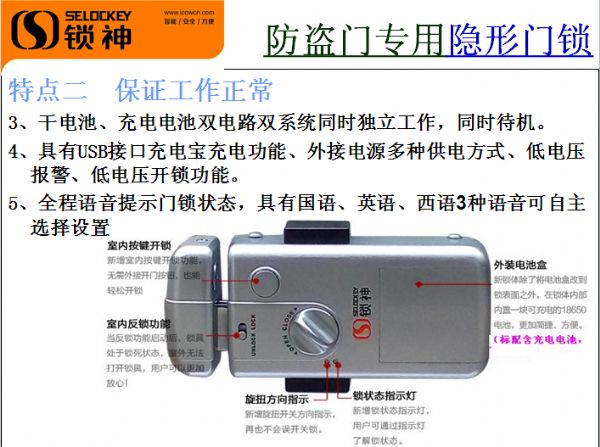 2. 双电路双系统独立控制模式,保证至少有一个系统正常工作,用户无需担心锁坏了开不了门. 真人主语音提示锁的工作状态及欠压提醒,有7种语言用户可自主设置。