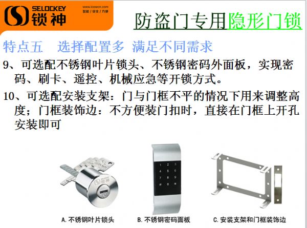 门禁开锁设备,无需改动. 10. 本锁可选配触摸屏密码面板或刷卡密码面板,其它功能同时存在.