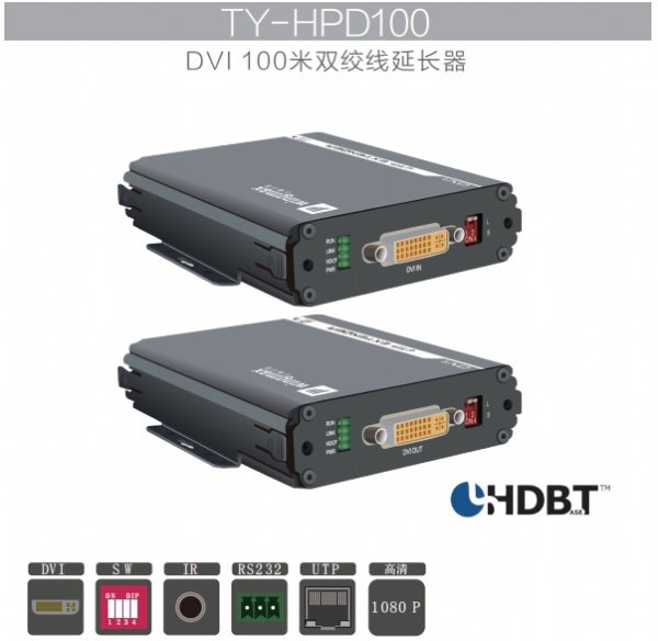 双绞线网线延长传输器TY-HPD100高清双绞线延长器系列产品是一款DVI数字视频传输设备。该设备使用Cat 5/ 5e/ 6双绞线电缆作为传输介质,无需设置,可将分辨率为1280x1024的DVI-D数字信号*远传输60m。该设备采取出色的防雷、防静电、抗干扰和