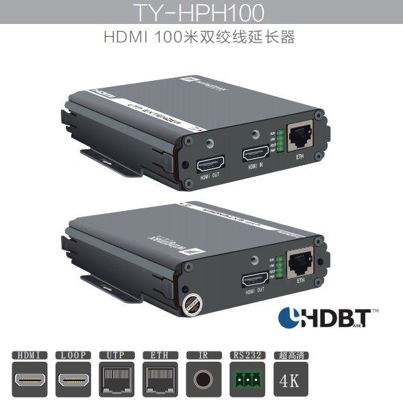 双绞线网线延长传输器天翼讯通TY-HPH100 高清双绞线延长器系列产品是一款将HDMI高清信号进行传输处理的高清信号处理设备。该设备采用一根CAT6类线,不仅打破了HDMI线材传输长度的限制,同时将分辨率高达1920x1080P的高清电视信号传输距离延长100m。在实际工程中,若与HDMI(高清接口)转DVI(数字视频借口)转换线配合使用,可以同时支持DVI设备。能够更加灵活实现HDMI高清视频精彩应用。目前该设备广泛应用于高清广告系统、数字标牌、卖场电视演示、会议系统、投影演示、家庭娱乐等高清场合。