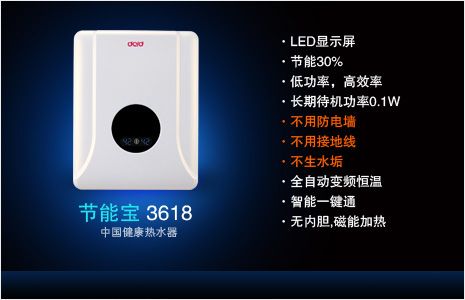 德尔顿速磁核心专利导热体,无内胆、不储水、不生水垢,热效率长期保持99.9%以上,节能30%,出水量大。速磁加热产生磁能活性小分子团水,让人体迅速吸收水中营养矿物质。