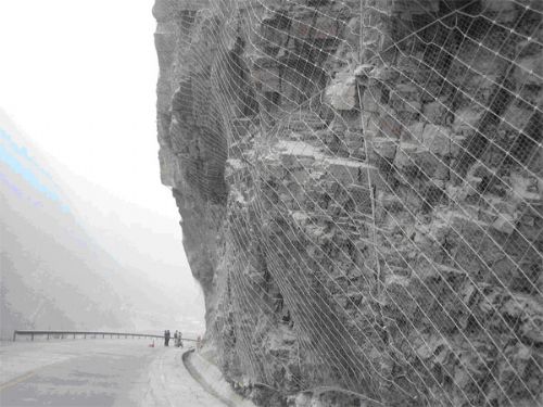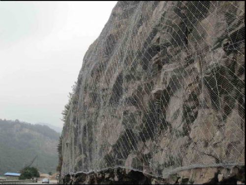 钢丝绳网为主的各类柔性网覆盖包裹在所需防护斜坡或岩石上,以限制坡面岩石土体的风化剥落或破坏以及为岩崩塌(加固作用),或将落石控制于一定范围内运动(围护作用)。