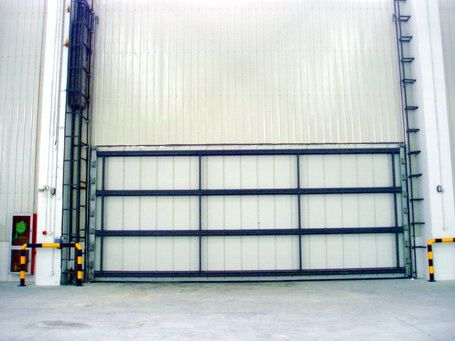 钢带,以保证铰链牢固安装。在5m以上的门板,每块门板内侧面设置一条高80mm加强筋以保证门板有抗十二级以上的抗风强度。