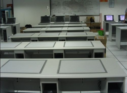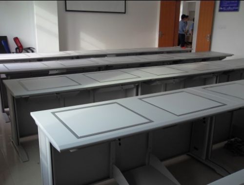 电脑桌主要应用于各种会议厅,电教室及多功能会议厅。智能翻转器与各种多媒体机房电脑桌均可配套使用,按下开关时液晶显示屏会自动翻起,键盘、鼠标也同时升起与桌面齐平,当不使用时,可用手动按下翻盖面板。整个翻转器与桌面齐平,产品具有防盗、防尘保持桌面平整,美化桌面等功能。电脑桌内还可以存放各类文具和学习用品。