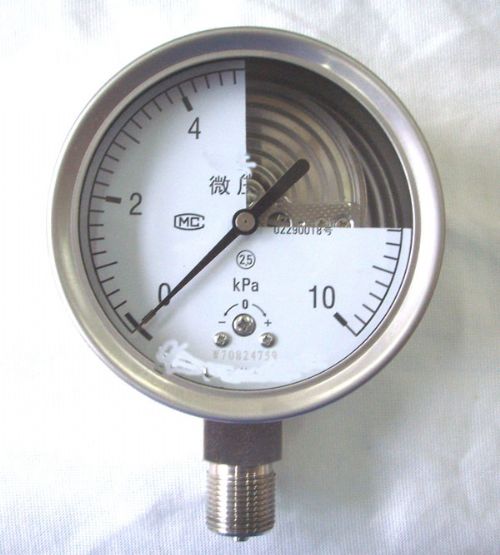齿轮传动机构),指示部件(包括指针与度盘)和外壳(包括表壳、衬圈和表玻璃)所组成。仪表的工作原理是基于波纹膜盒在被测介质的压力作用下,其自由端产生相应的弹性变形,再经齿轮传动机构的传动并予放大,由固定于齿轮轴上的指针逐将被测值在度盘上指示出来。还有调零装置,可以方便调整零位。