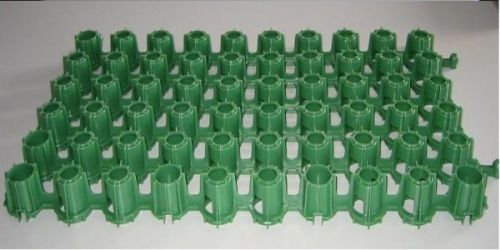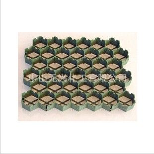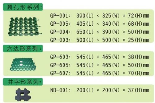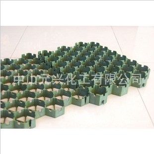 以高分子聚乙稀为主要原料,添加增加玻纤及抗老化剂等.材料采用高压注塑成形工艺压制出窝蜂状连续的壳体,具有立体空间和一定的支撑高度及强度.用于停车场,消防通道、消防登高面、人行通道等绿地。对草坪起到保护作用,又称绿色草坪保护垫。