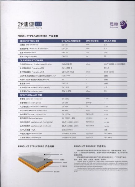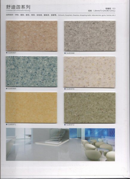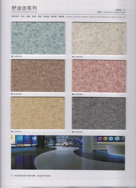 特点:舒迪迦系列地板是高品质环保型多层复合产品,具备高度耐磨、耐压、抗污,以及很好的产品稳定性。使用环保型非邻苯类增塑剂。给人体和环境健康的保障。舒迪迦地板以其优异的产品性能和独特的设计,广泛适用于学校、医院、剧场、商场、实验室、健身房、居家等。