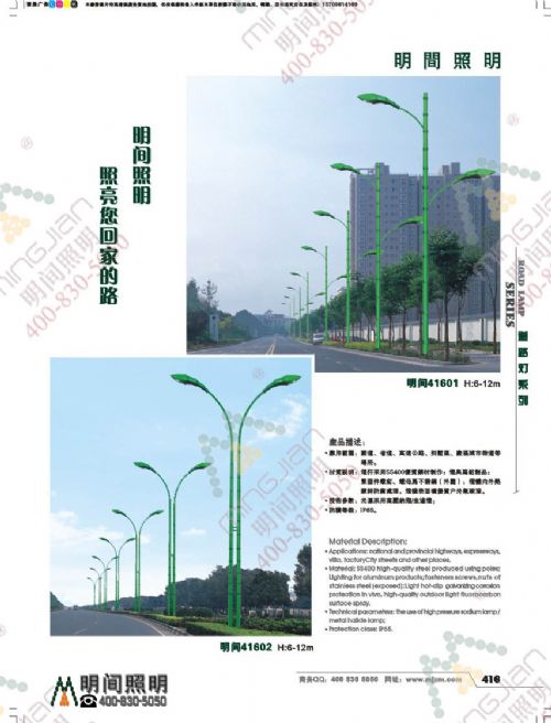 庭院灯、LED路灯等广泛应用于开发区、广场、别墅区、公路等场所,明间照明厂有较强的技术力量,设备齐全,品质过硬,先进独特的设计,款式多样,工艺先进,设备精良,完善的检测手段,更新迅速。