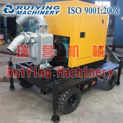 柴油机自吸泵-城市防台防汛移动抢险排水*移动泵站,又称柴油机驱动无堵塞泵,主要用于市政排污及防涝工程、农业灌溉,工业排水、排污等广泛领域,根据类型又可分为固定式、二轮移动式、四轮移动式、防雨拖车式、带防风雨罩户外型。配空心轮胎、实心轮胎、带牵引拖车。瑞营移动式柴油机自吸泵机组是在反复研究国内外同类技术的基础上开发成功的一种结构新颖的产品。该泵组集自吸和无堵塞排污于一体,采用柴油机驱动轴向回流外混式,并通过泵体、叶轮流道的独特设计,使用时不需要安装