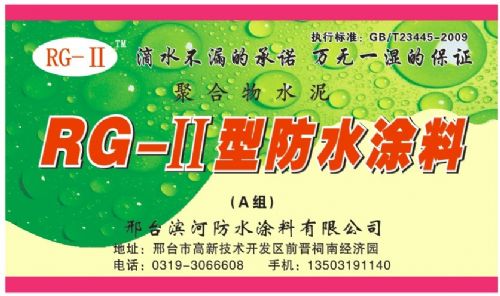 防水涂料有限公司生产聚合物水泥RG防水涂料,是著名的防水*褚秀彬高级工程师在2004年研制成功的新产品,已申请国家专利,专利申请号:201310028241.2。货到工地按国标GB/T23445-2009随便抽检,100%合格。RG防水涂料防水效果很好,耐老化。
