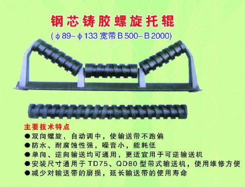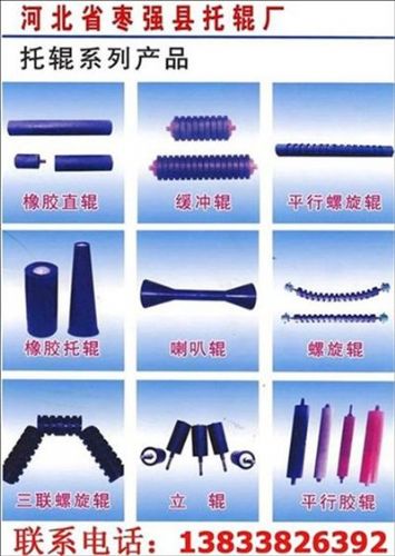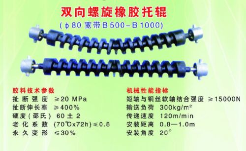 跑偏和保护输送带等特点。橡胶托辊比传统的铁质托辊性能优异,磨损系数低,比重小,重量轻,更换方便,而且噪音低,运转平稳,更适合于生产条件恶劣的工作环境,使用寿命高。产品包括橡胶托辊、橡胶缓冲托辊、双向螺旋橡胶托辊、平行螺旋橡胶托辊、锥形橡胶托辊、喇叭形橡胶托辊、橡胶立辊等,还可根据用户需要定做。